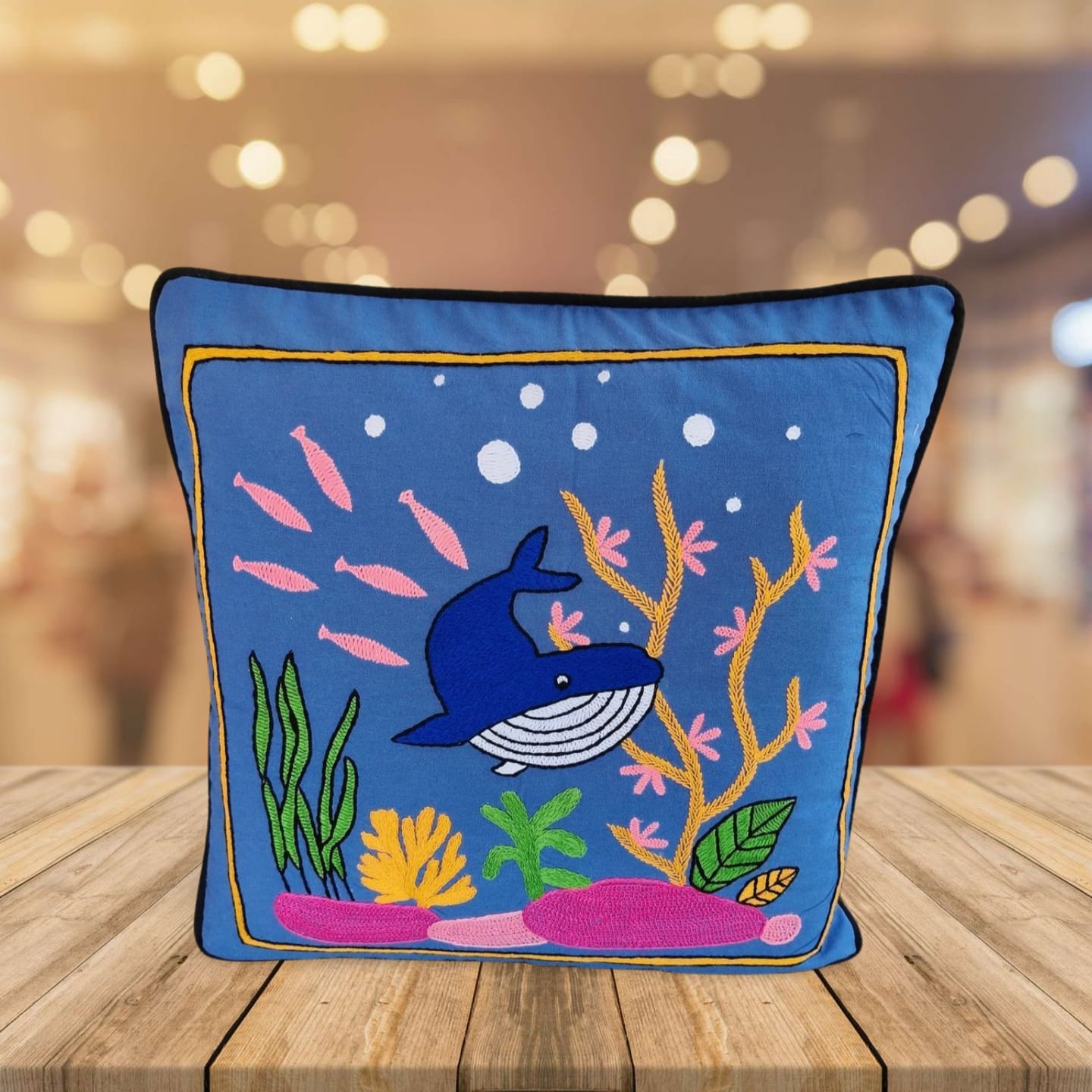 Inspired by the vibrant world of sea life, the design features beautifully embroidered fish, corals, and starfish on a soothing light blue cotton fabric. Perfect for adding a refreshing ocean-inspired touch to your home decor.