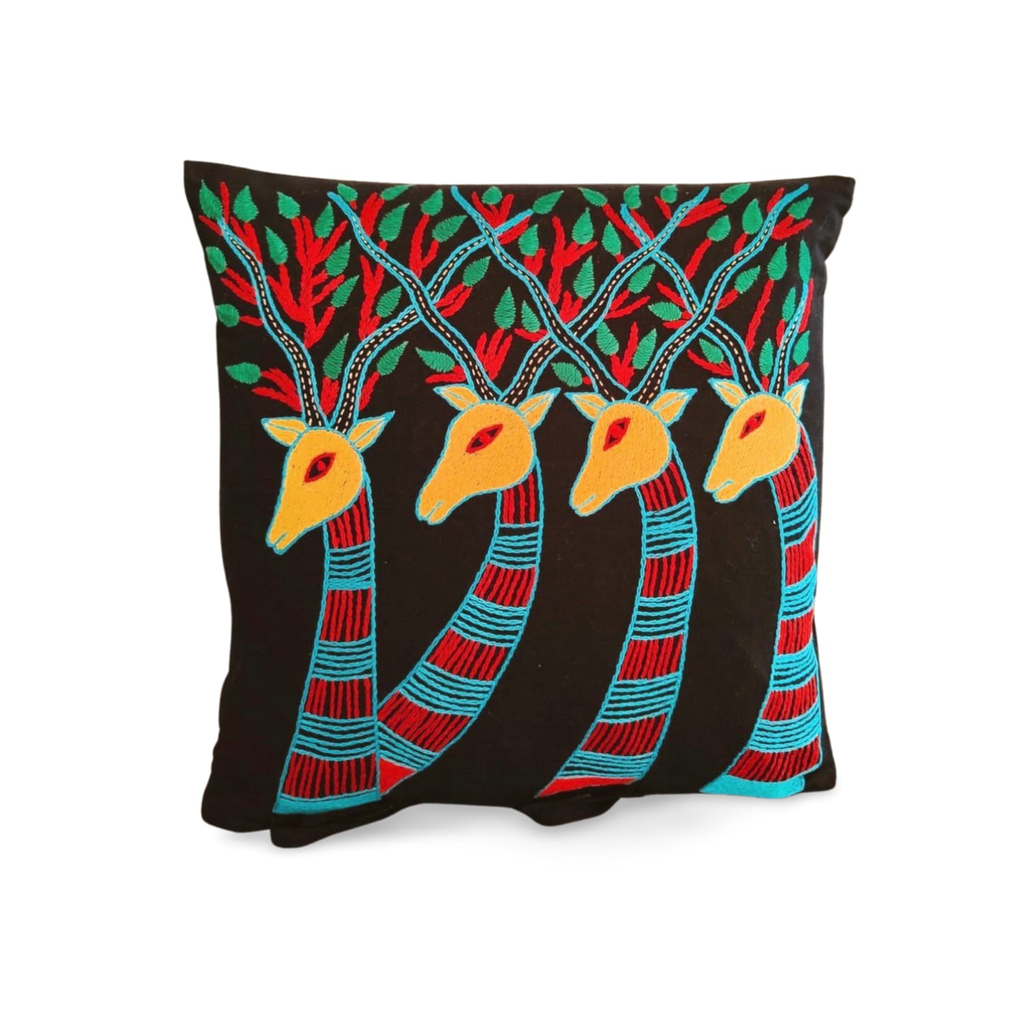 Inspired by Gond Art, a traditional tribal art form from Central India, this captivating design features intricately embroidered deer motifs that symbolize nature, life, and harmony. Set against a soft black cotton base fabric, the elegant color contrast and fine detailing make it a sophisticated, nature-inspired accent that brings warmth and depth to your living room, bedroom, or reading corner. Perfect for bohemian, modern, or classic home decor.